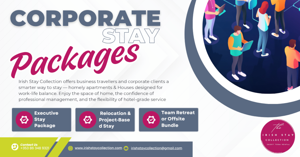 Irish Stay Collection offers business travellers and corporate clients a smarter way to stay — homely apartments & houses designed for work-life balance, fully serviced, and tailored to corporate needs. Enjoy the space of home, the confidence of professional management, and the flexibility of hotel-grade service.